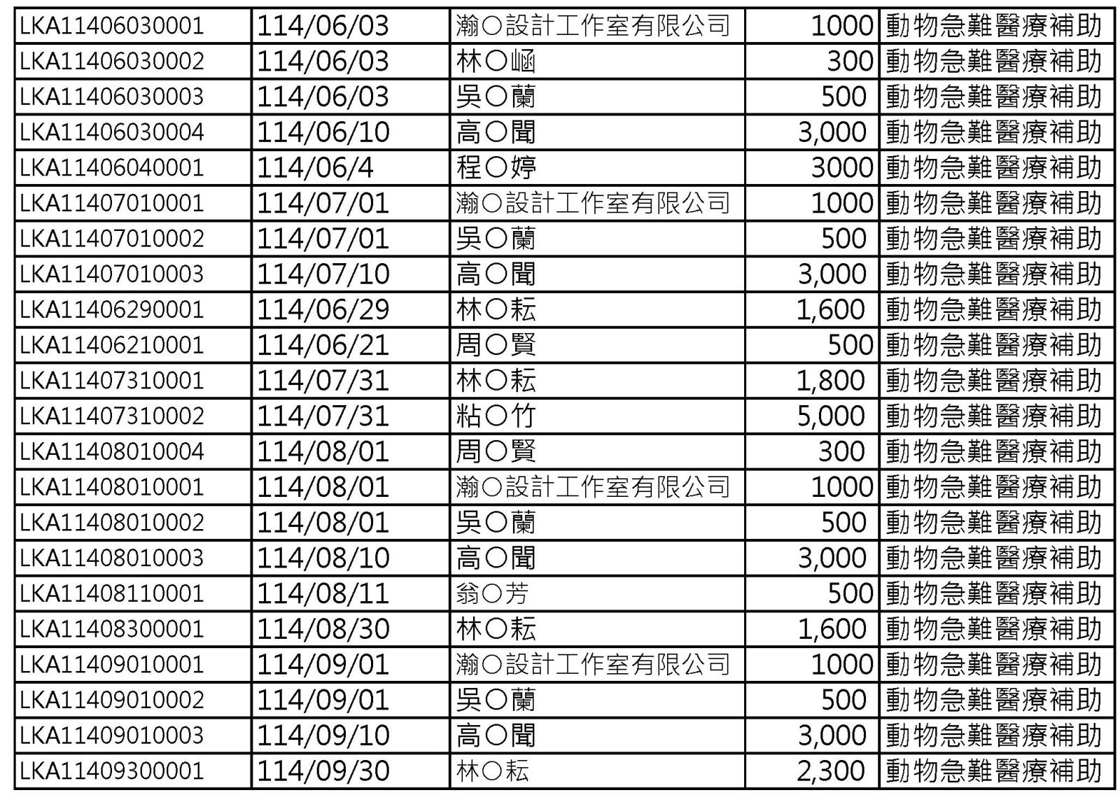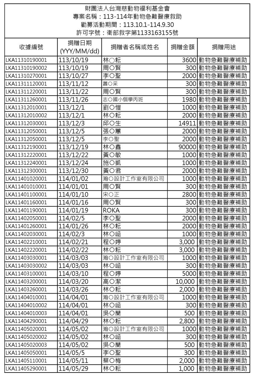 113-114年動物急難醫療救助捐款人名單